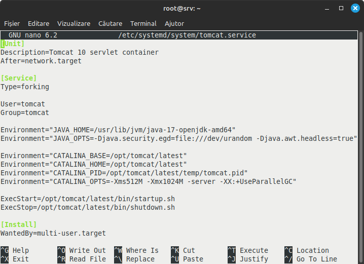 Utilizând editorul nano vom crea fișierul tomcat.service în directorul /etc/systemd/system: